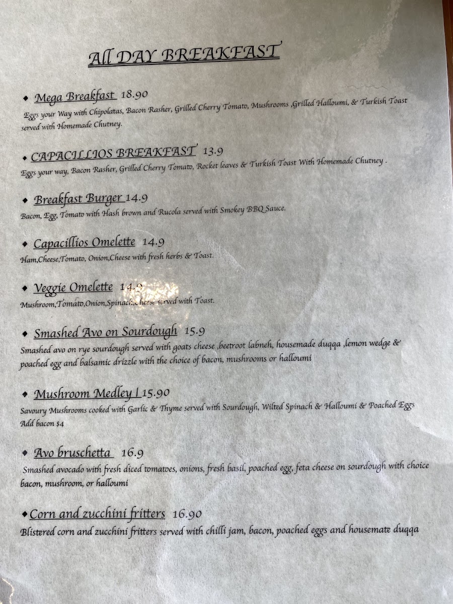 - All Day Breakfast: Savor the Capacillios Omelette or the Mushroom Medley, each crafted with fresh ingredients and love.